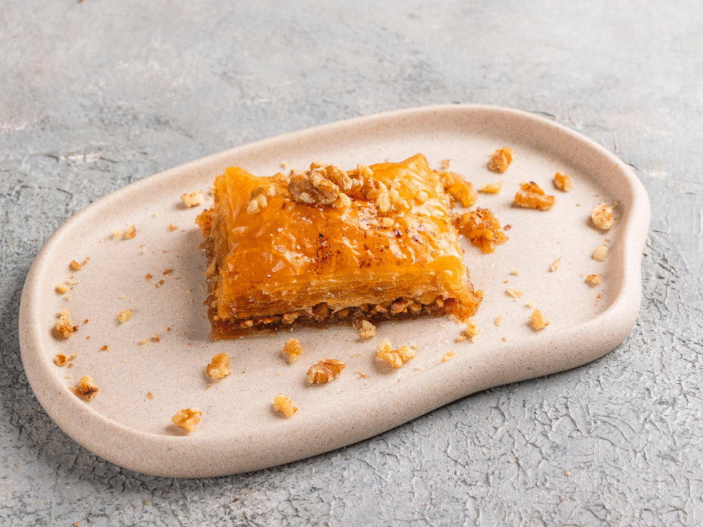layered puff pastry with walnuts and sugar syrup