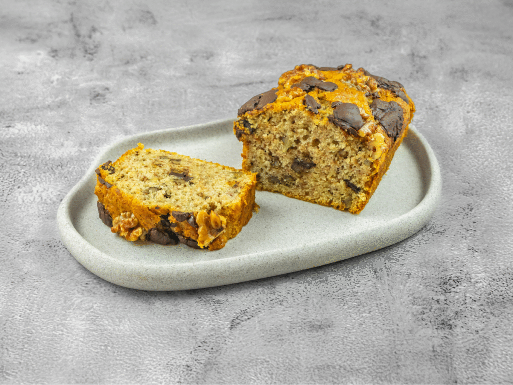 soft banana cake with walnut, chocolate chips and a hint of cinnamon