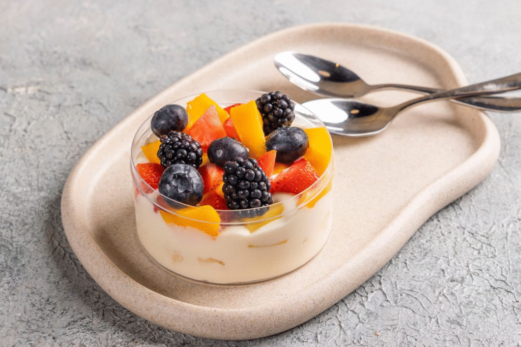 homemade vanilla pudding layered with soft sponge cake and topped with fresh seasonal fruits