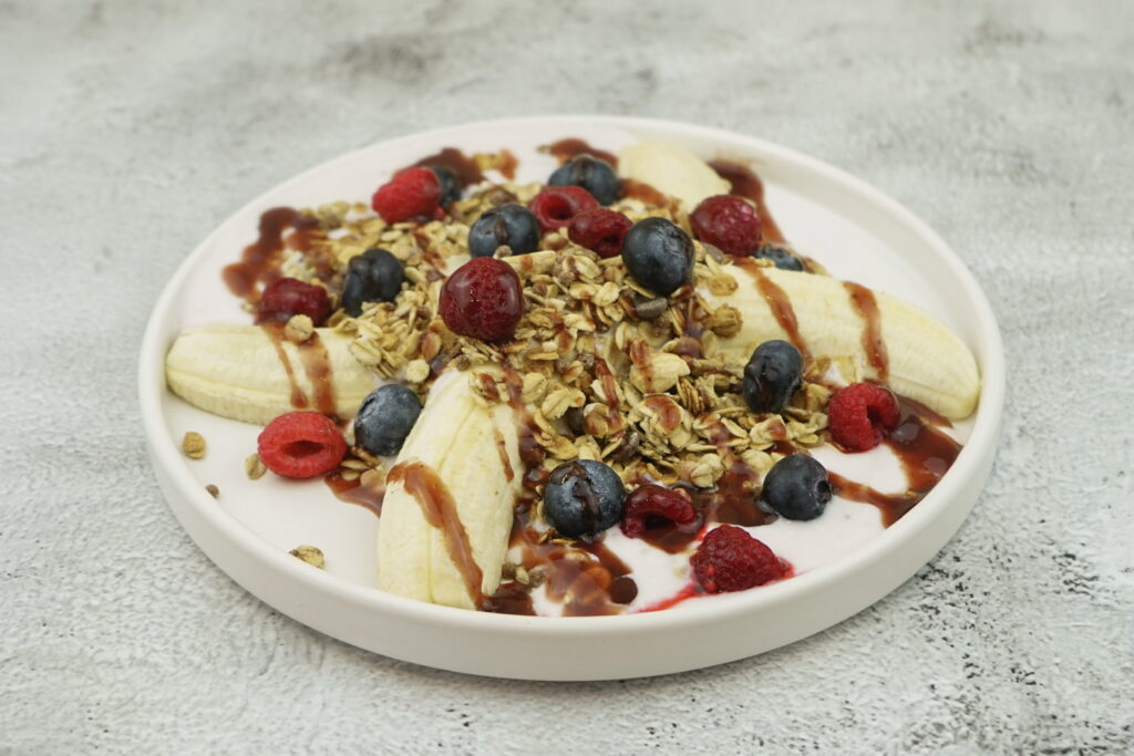 sliced banana served with homemade strawberry yogurt, topped with berries and a crunchy topping