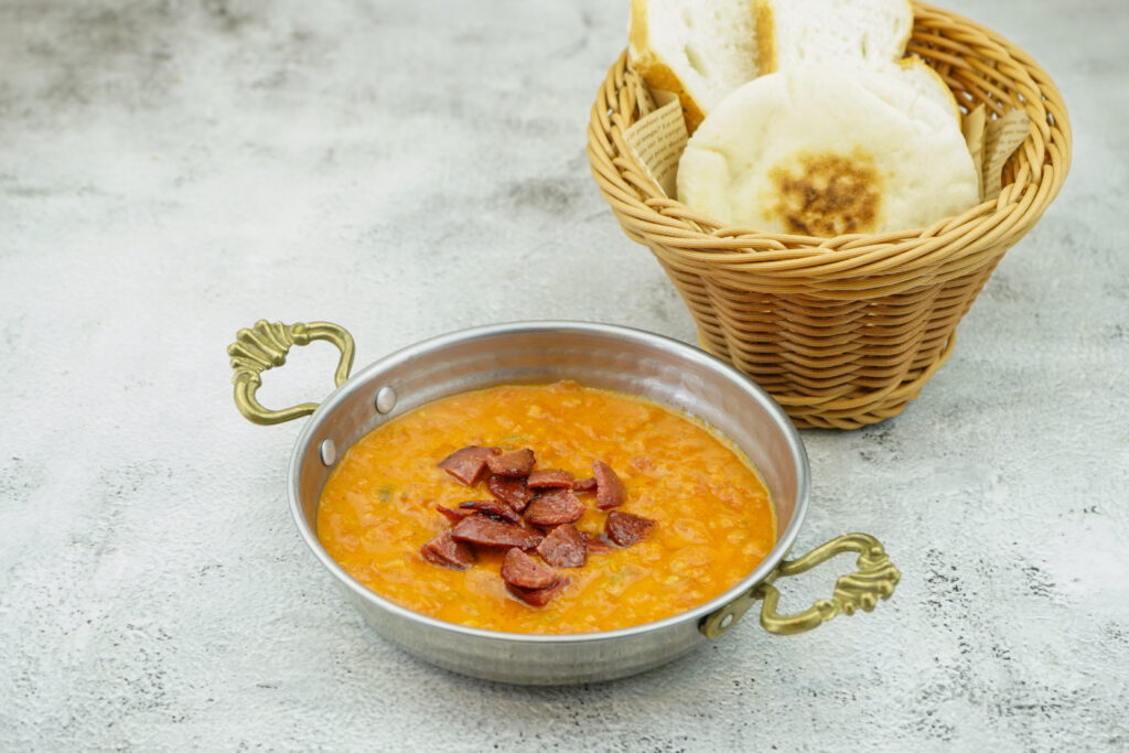cooked tomato, green peppers, turkish spices with egg yolk, served with fresh bread