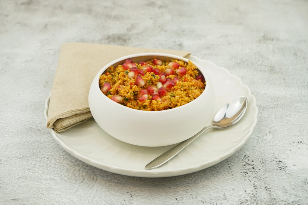 turkish bulgur salad with parsley, spring onion, tomato, pomegranate and pomegranate syrup
