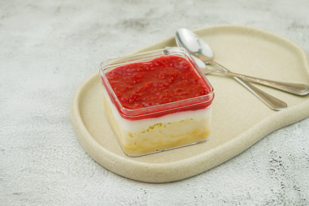 soft milk soaked sponge cake topped with raspberry