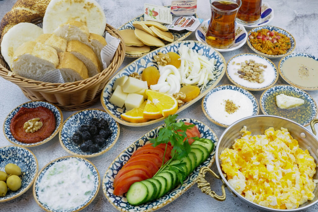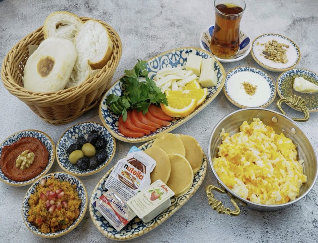 fresh bread | vegetables | olives | acuka | cheese | kisir | cheese cream | honey with kaymak | chocolate | jam | butter | pancakes | granola yoghurt | turkish tea| scrambled eggs